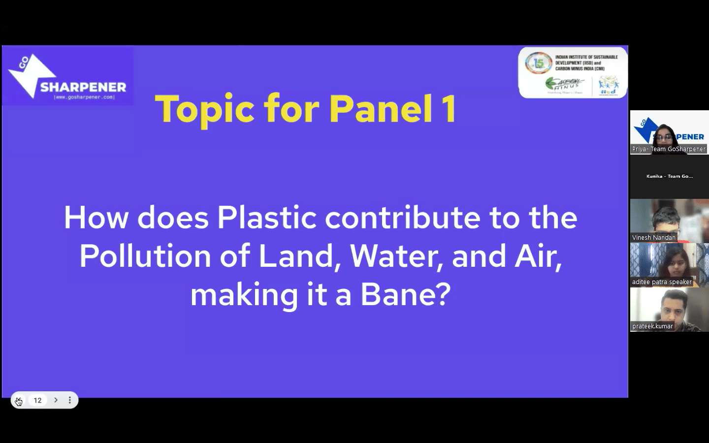 Indian Institute of Sustainable Development (IISD) conducted a National Panel Discussion on the topic “Planet or Plastic ?” in association with Go Sharpener on 12th February 2023 for classes 4th to 12th. Best performers were rewarded with vouchers and certificates. 86 students across 27 schools participated in the Panel Discussion .We covered approximately 15 topics, The students showed maximum interest and came up with some amazing answers.